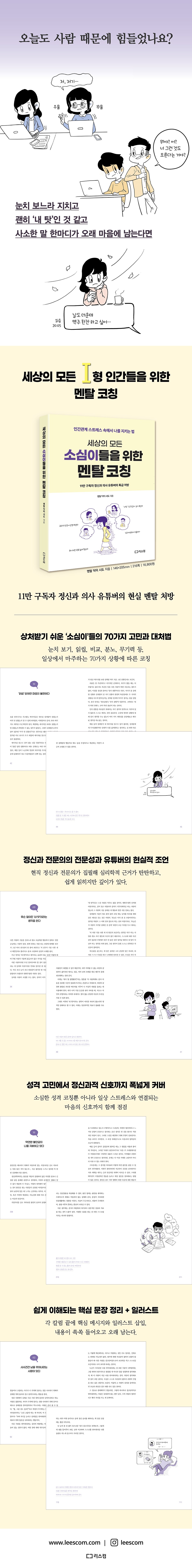 오늘도 사람 때문에 마음이 흔들리는 이들을 위한 현실적인 멘탈 가이드. 〈세상의 모든 소심이들을 위한 멘탈 코칭〉은 인간관계 속에서 상처받기 쉬운 ‘소심이’들이 스스로를 지키는 방법을 알려주는 책이다. 다른 사람의 시선이 지나치게 신경 쓰이고, 화가 나도 참고 넘기며, 무슨 일이든 ‘내 탓’처럼 느끼는 사고습관을 점검한다. 11만 구독자 정신과 의사 유튜버 ‘멘탈 닥터 시도’가 제안하는 70가지 생각 전환 훈련을 통해 유리처럼 깨지기 쉬운 멘탈을 단단하게 세워보자.